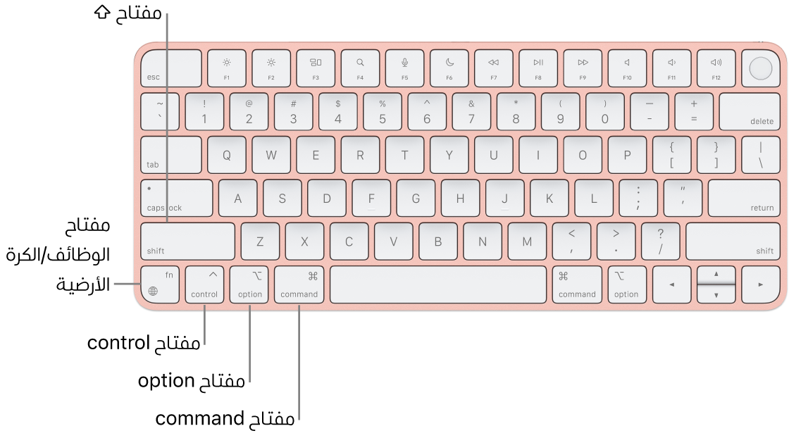 ملاحظة: إذا كان لديك لوحة مفاتيح ماجيك من Apple المزودة ببصمة الإصبع ولوحة مفاتيح أرقام، يكون مفتاح الوظائف/الكرة الأرضية على يمين مفتاح ⌦.
